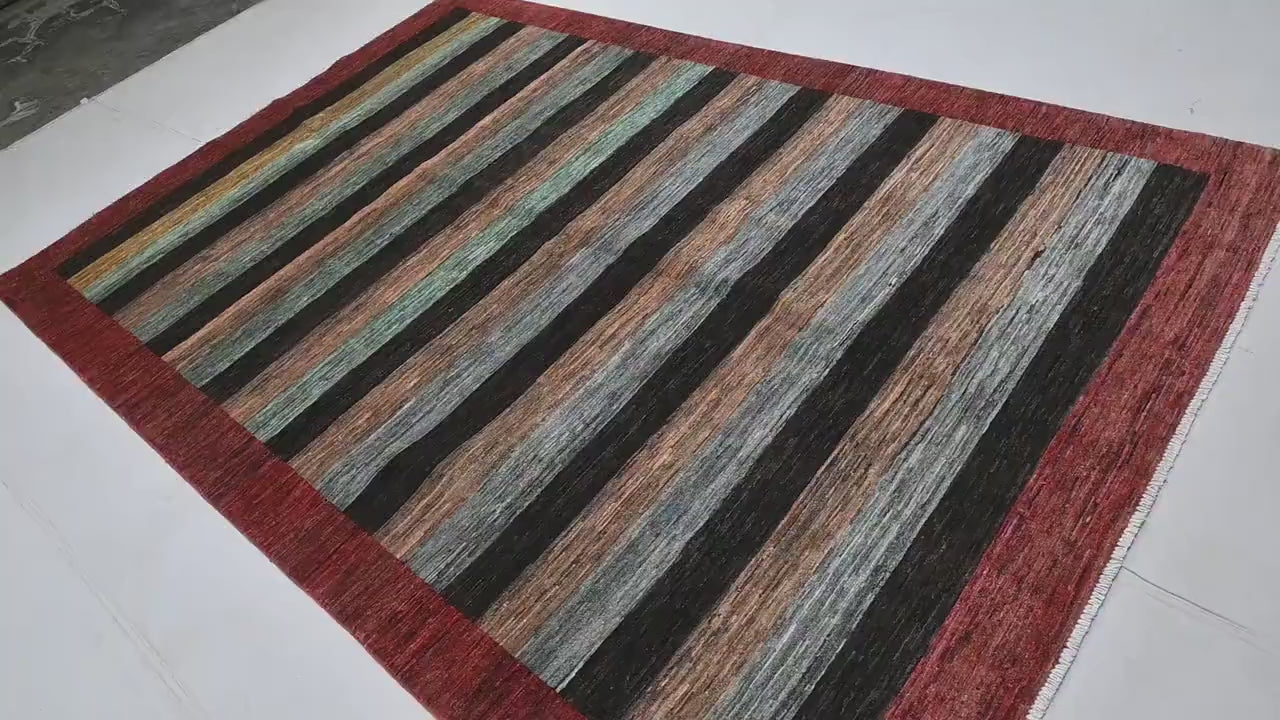 Afghan Striped Gabbeh Rug – 6×9 ft | Hand-Knotted Wool | Gray, Bronze, Black, Brown & Red