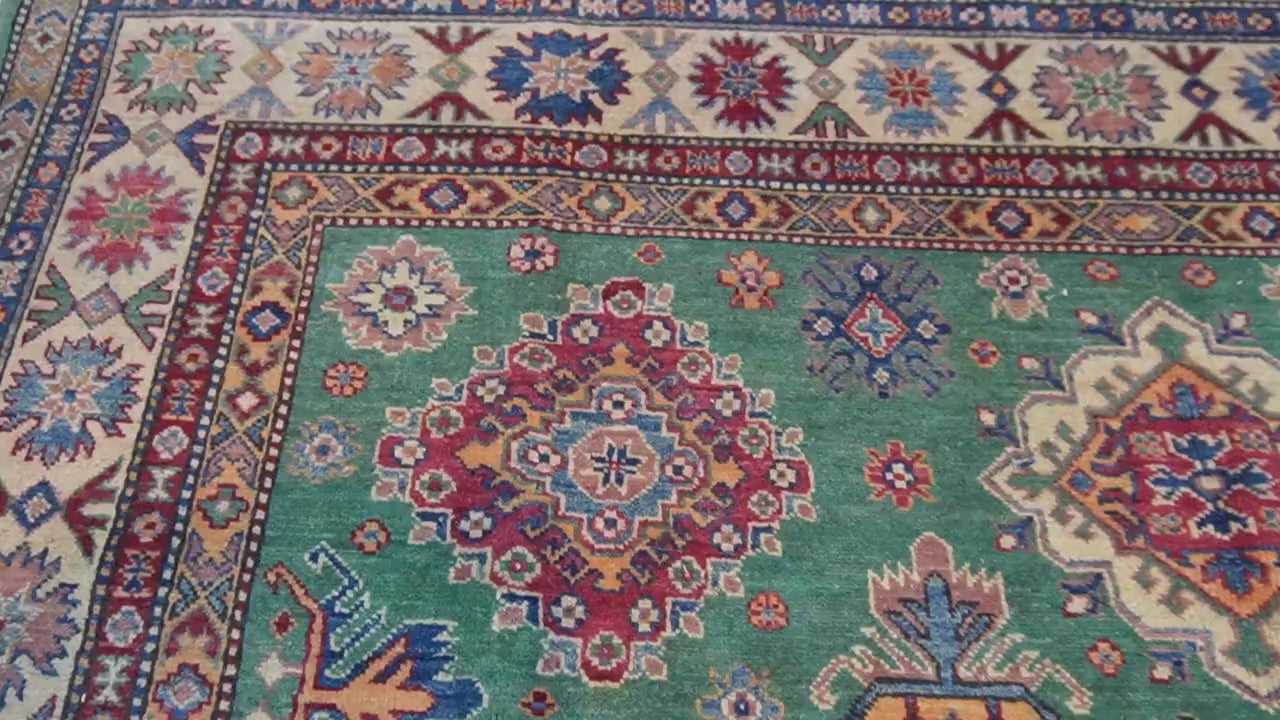 Infuse your home with timeless Afghan craftsmanship and vibrant color through this Green Bijdar Kazak Rug, a hand-knotted masterpiece woven by Turkmen women artisans in Andkhoy Village, Afghanistan.